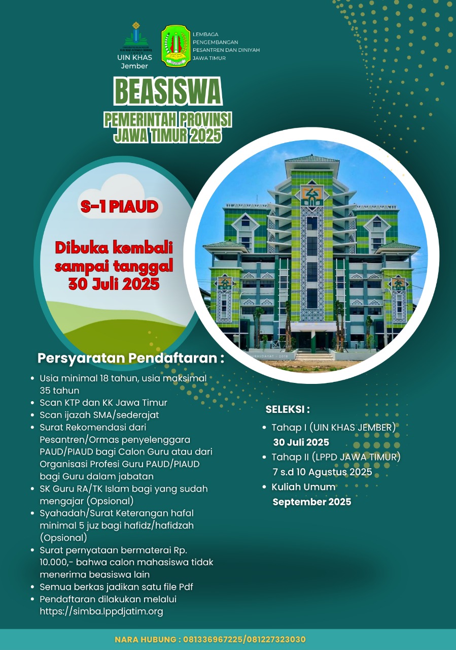 Kini Pendaftaran Mahasiswa Baru Program Studi Pendidikan Islam Anak Usia Dini (PIAUD) Jalur Beasiswa Pemerintah Provinsi Jawa Timur Resmi Diperpanjang Sampai 30 Juli 2025.